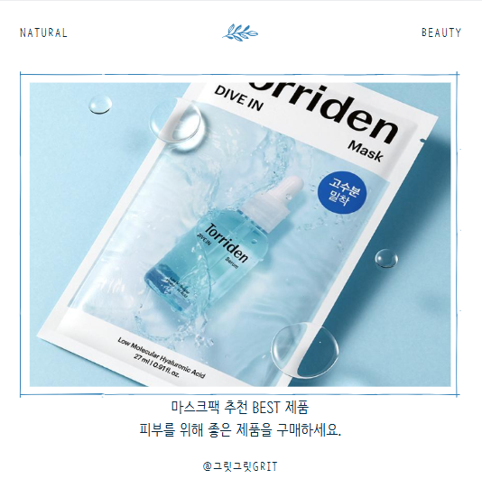 토리든 다이브인 저분자 히알루론산 마스크팩은 수분폭탄이라고 할 수 있을 정도의 피부에 수분을 가득 채워주는 제품을 유명합니다. 성분 또한 순해서 민감성 피부인 분들도 사용할 수 있으며, 사용 후기도 좋은 호불호가 심하지 않은 마스크팩!